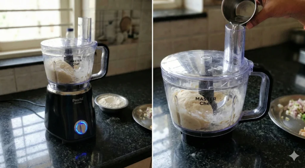 - The “Water Ratio” Trick: You cannot just dump water and flour like you do by hand. You must measure exactly (usually 1:1 or slightly less). If you add too much water, it becomes a sticky mess that glues to the blade.